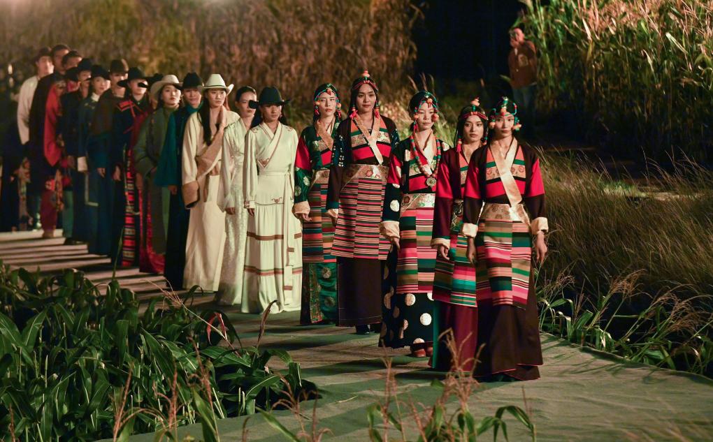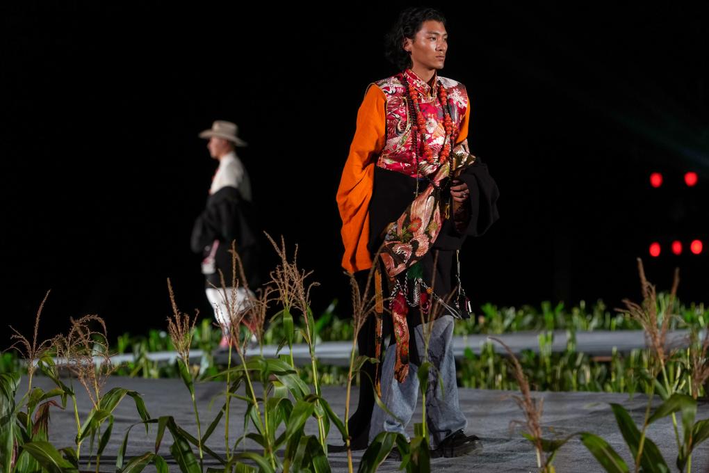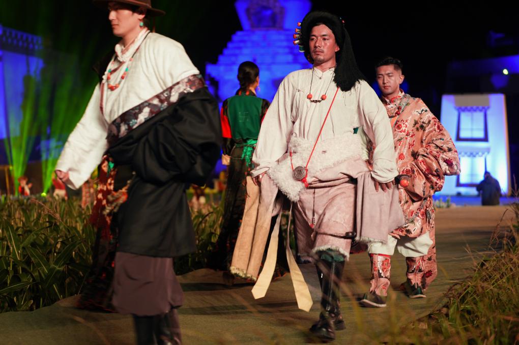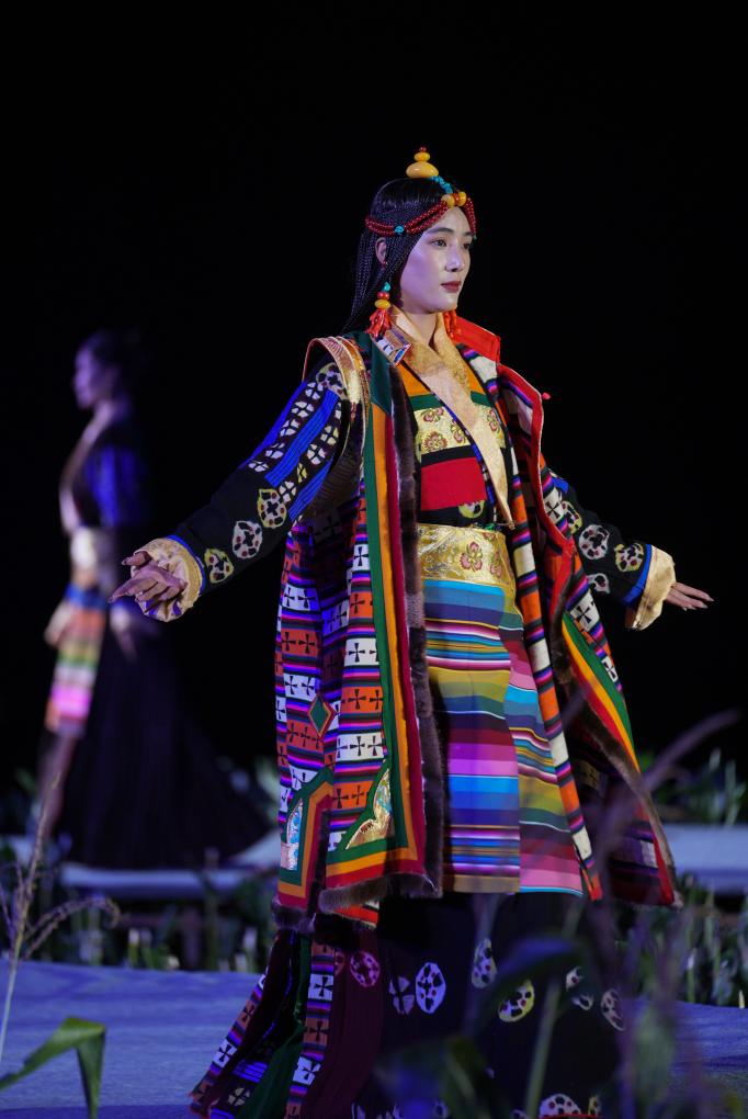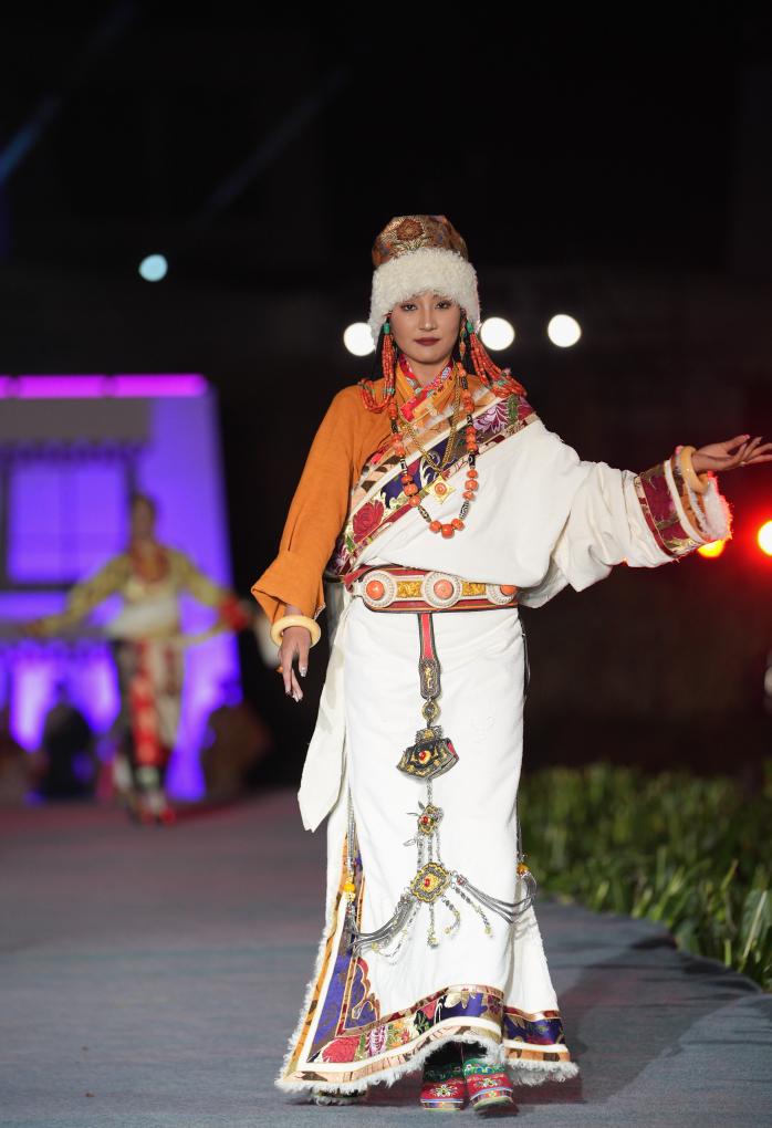 20日、ファッションショーで披露されたチベット族の伝統衣装。(郷城=新華社記者/江宏景)