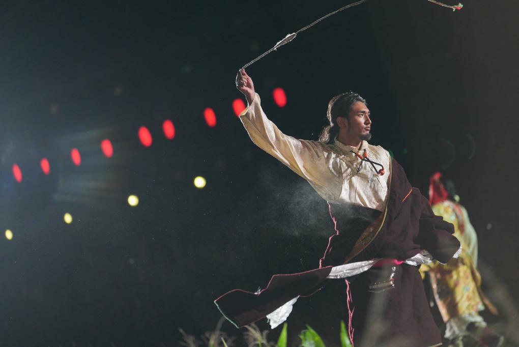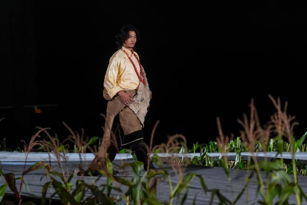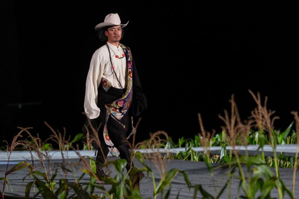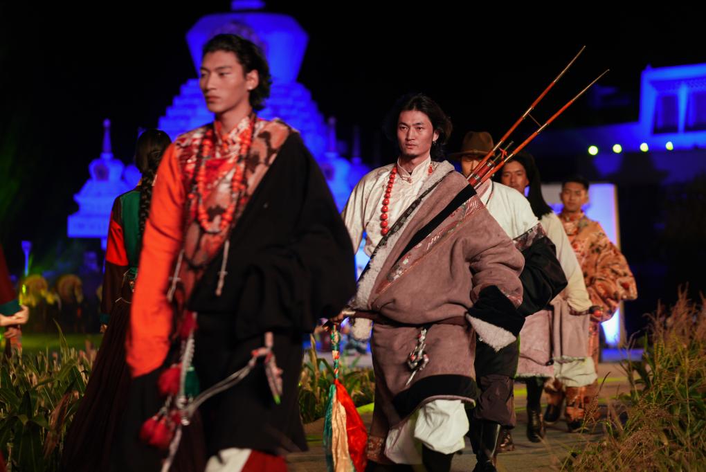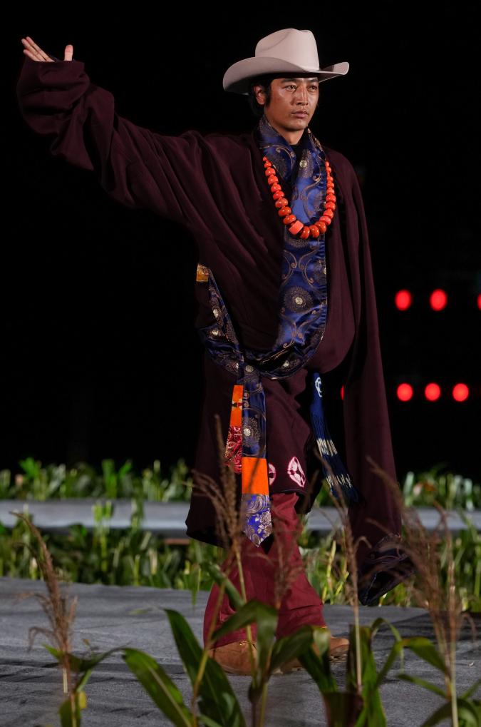 20日、ファッションショーで披露されたチベット族男性の伝統衣装。(郷城=新華社記者/江宏景)