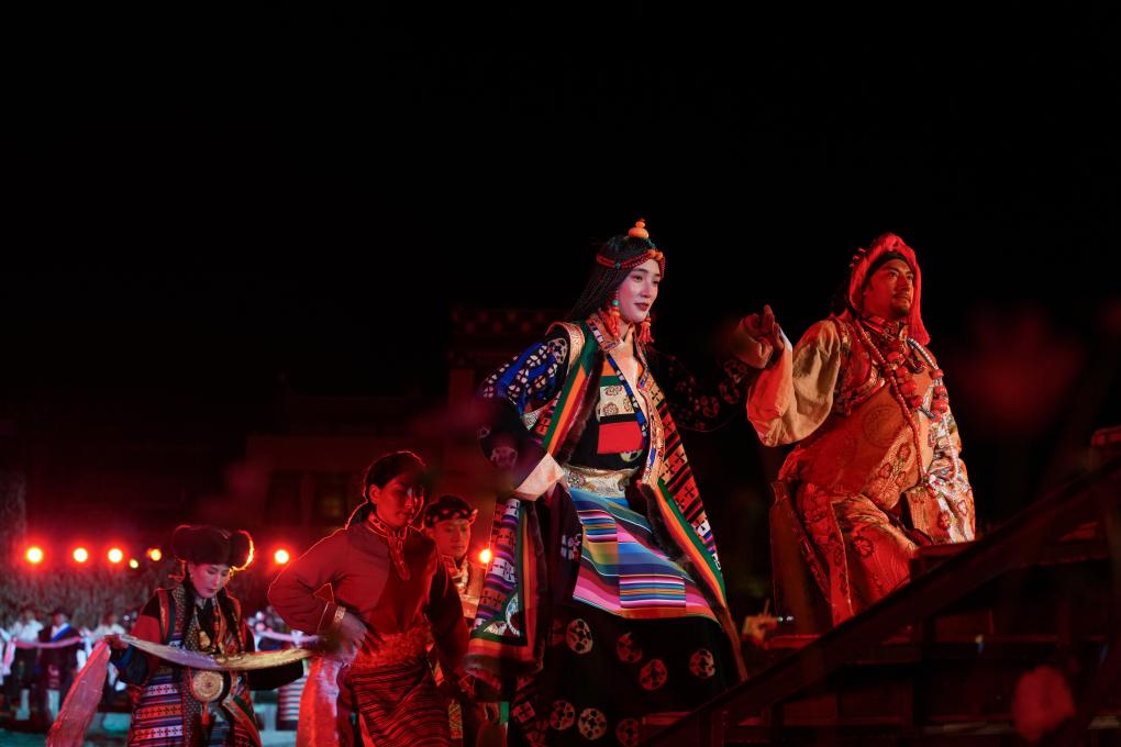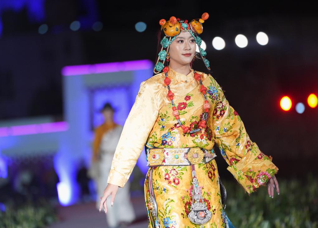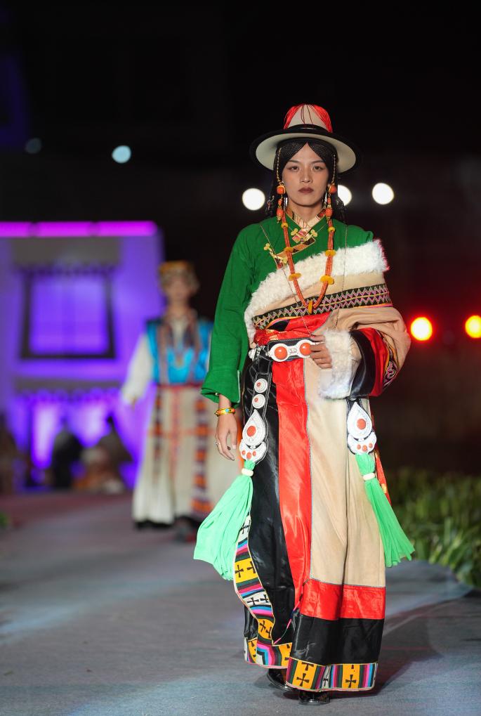 20日、ファッションショーで披露されたチベット族女性の伝統衣装。(郷城=新華社記者/江宏景)