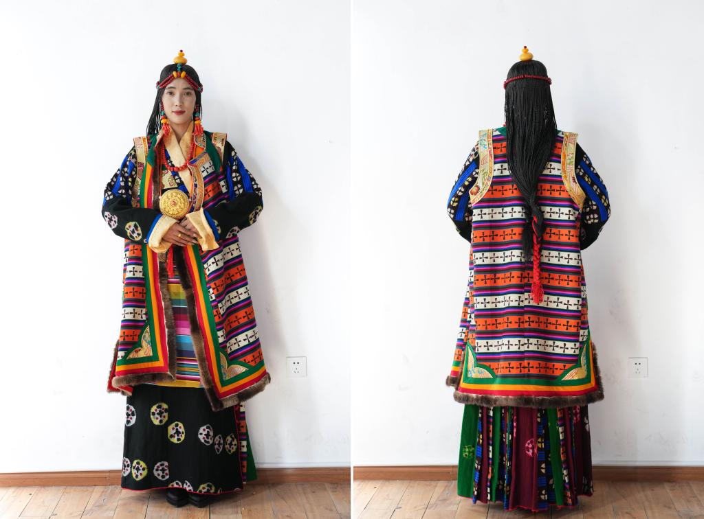 20日、伝統衣装をまとったチベット族の女性。(組み合わせ写真、郷城=新華社記者/江宏景)