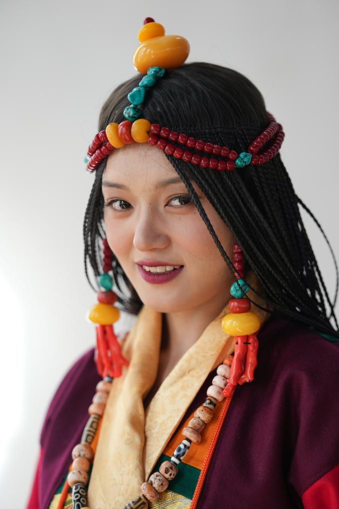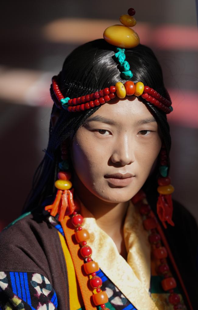 20日、伝統衣装をまとい、頭飾りを着けたチベット族の女性。(郷城=新華社記者/江宏景)