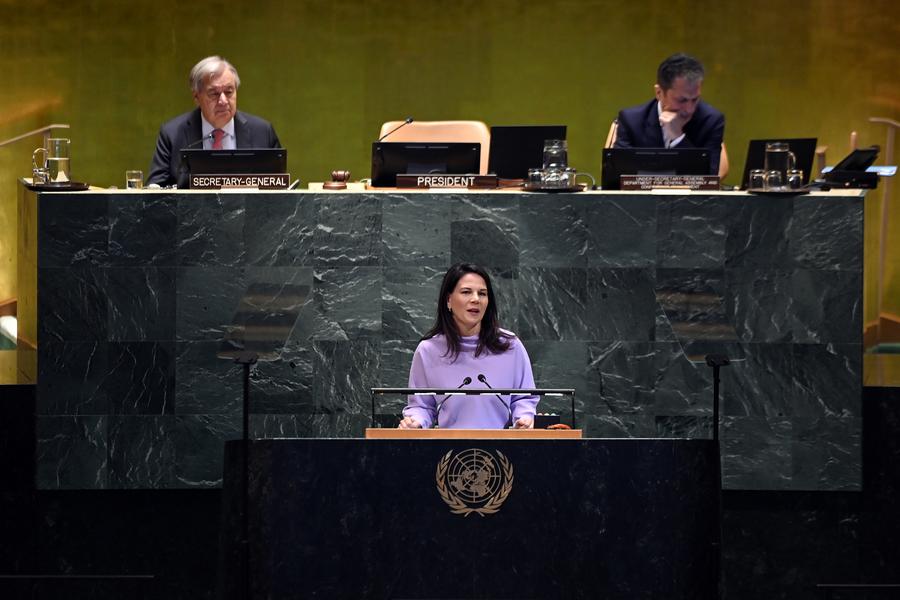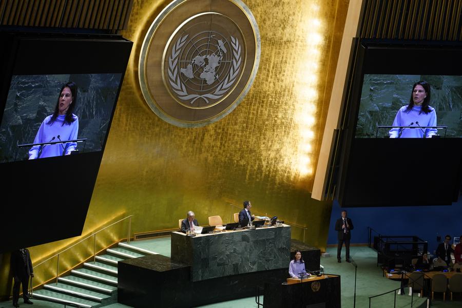 22日、ニューヨークの国連本部で開かれた北京世界女性会議30周年記念ハイレベル会合で演説する第80回国連総会のベアボック議長。(国連=新華社記者/呉暁凌)