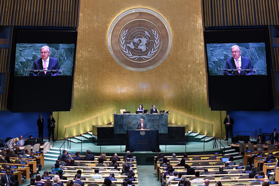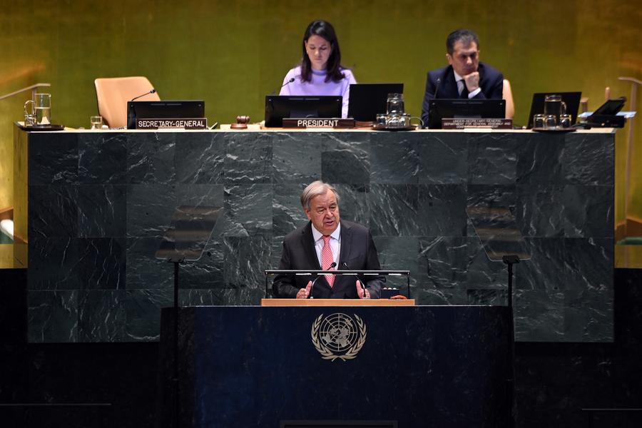 22日、ニューヨークの国連本部で開かれた北京世界女性会議30周年記念ハイレベル会合で演説する国連のグテレス事務総長。(国連=新華社記者/李睿)