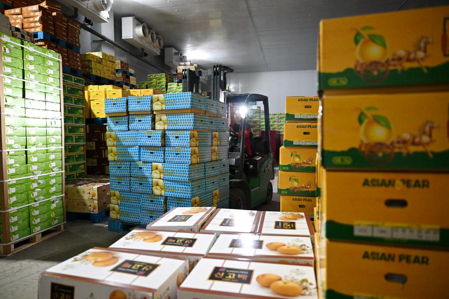 23日、農産物の生産や輸出などを手がける泊頭東方果品の冷蔵倉庫で、梨を運ぶフォークリフト。(石家荘=新華社記者/牟宇)