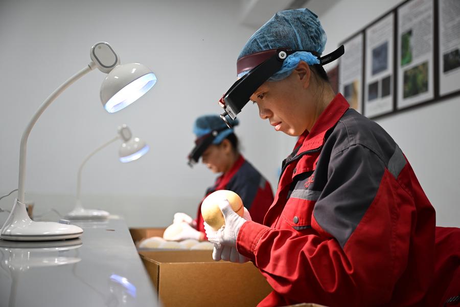 23日、農産物の生産や輸出などを手がける泊頭東方果品で梨を仕分ける作業員。(石家荘=新華社記者/牟宇)
