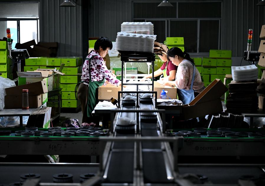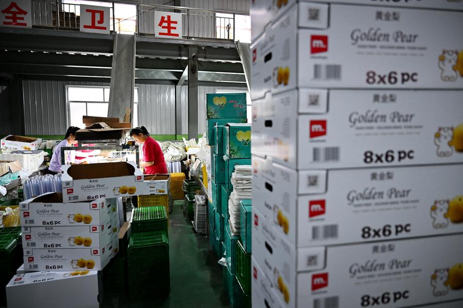 23日、農産物の生産や輸出などを手がける泊頭東方果品で梨を包装する作業員。(石家荘=新華社記者/牟宇)