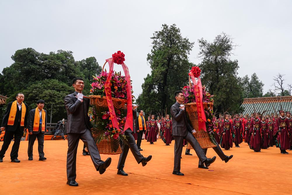 28日、乙巳年祭孔大典で献花する各界の人々。(曲阜=新華社記者/朱崢)