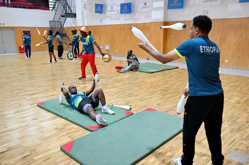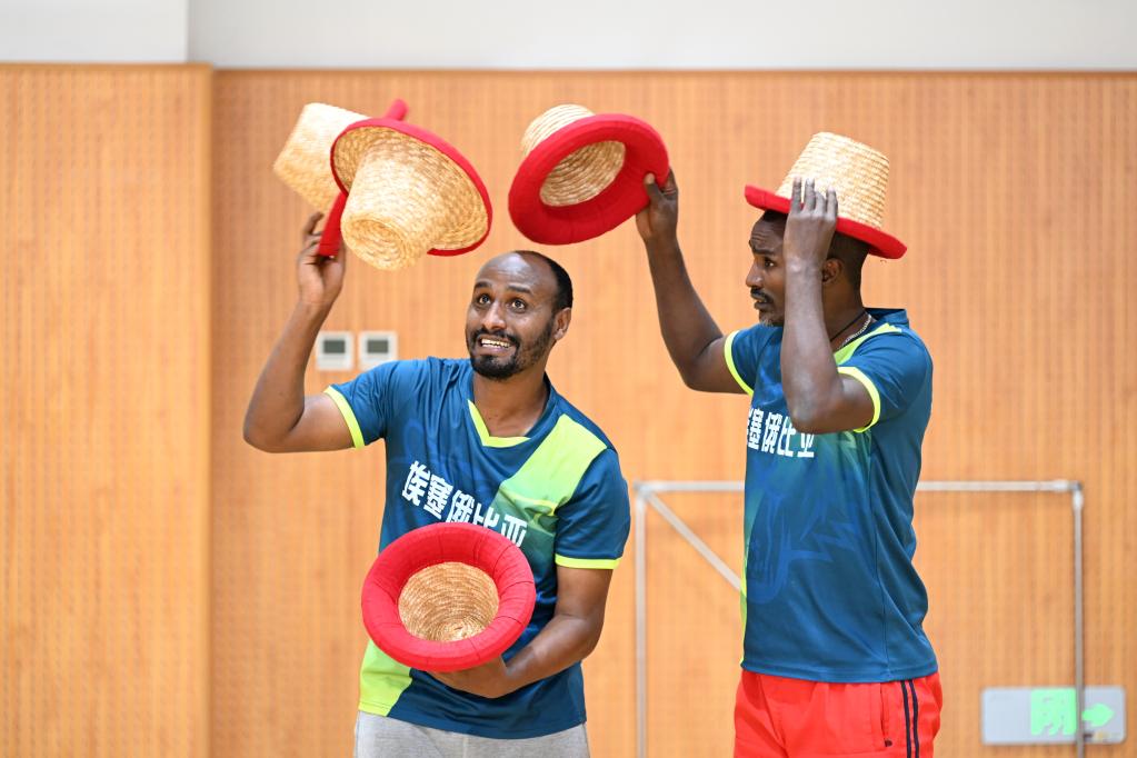 28日、河北省呉橋県の呉橋雑技芸術学校で、帽子を使った雑技を練習するエチオピア人留学生。(呉橋=新華社記者/牟宇)