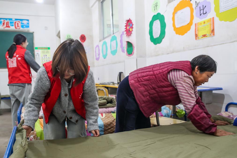 28日、避難所に指定された木林小学校で、被災者のベッドメイクを手伝うボランティア(手前左)。(定西=新華社記者/郎兵兵)