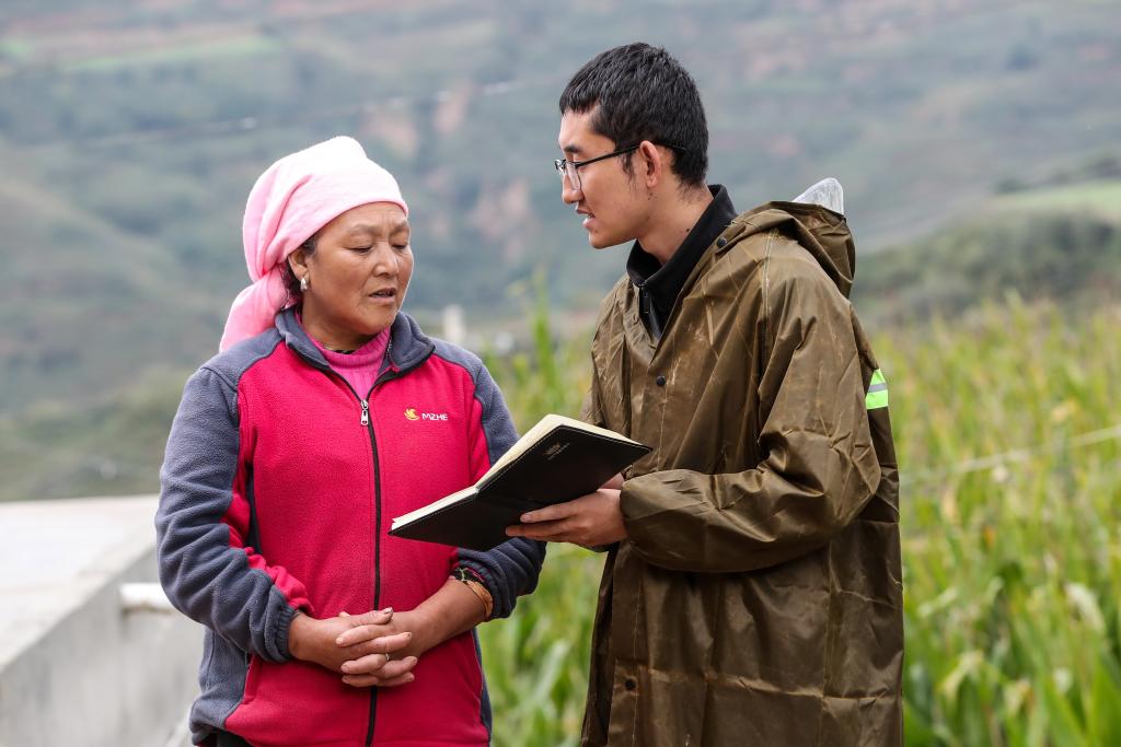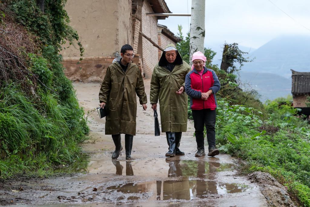 28日、漳県武陽鎮汪家河村で、避難住民の状況を確認する地元幹部。(定西=新華社記者/郎兵兵)