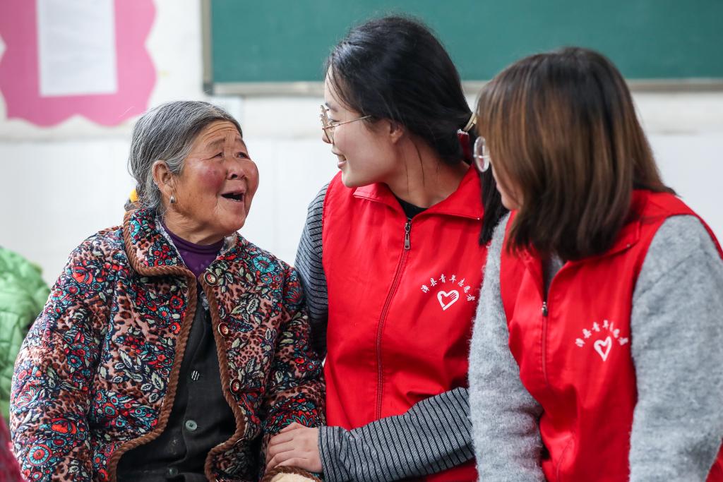 28日、避難所に指定された木林小学校で、被災者(左端)と話をするボランティア。(定西=新華社記者/郎兵兵)