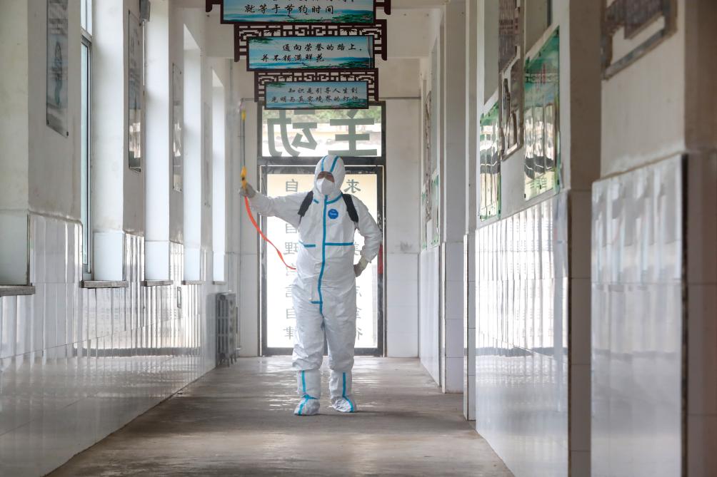 28日、避難所に指定された木林小学校で、校舎を消毒する作業員。(定西=新華社記者/郎兵兵)