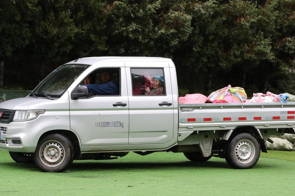 28日、被災者を乗せ、避難所に指定された木林小学校に到着した車。(定西=新華社記者/郎兵兵)