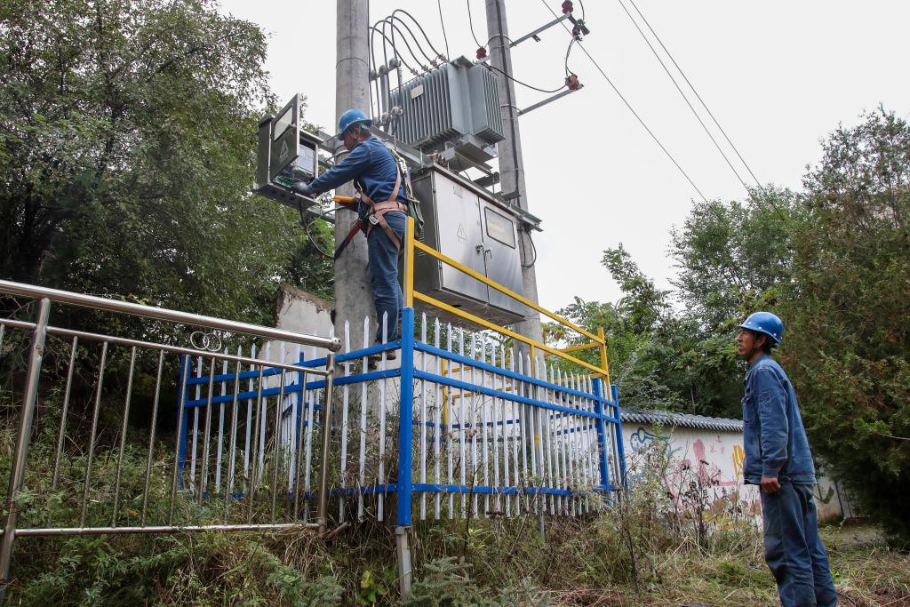28日、避難所に指定された木林小学校で、電力設備を点検する電力会社の職員。(定西=新華社記者/郎兵兵)
