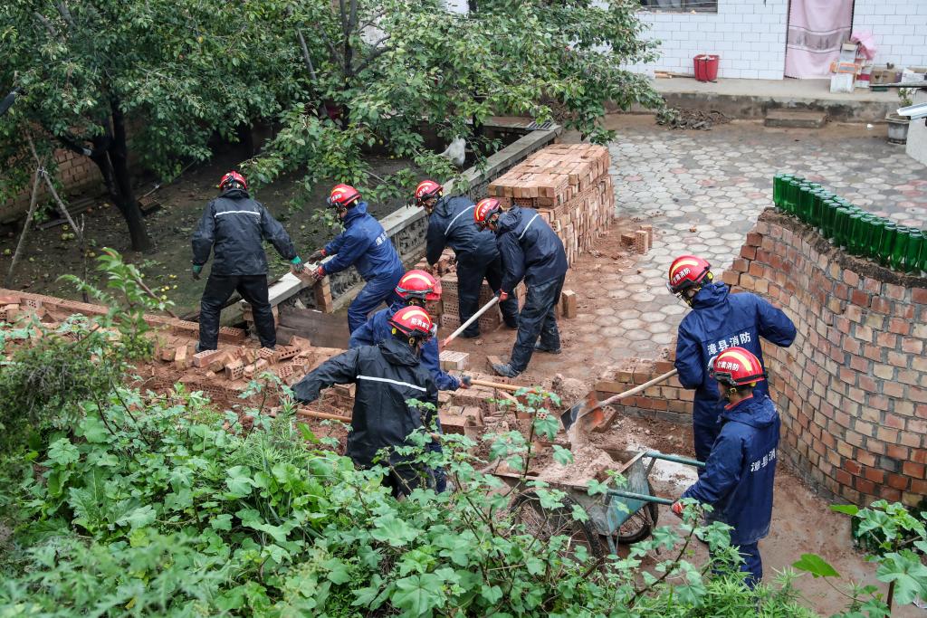 28日、漳県武陽鎮汪家河村で、危険除去作業にあたる消防隊員。(定西=新華社記者/郎兵兵)