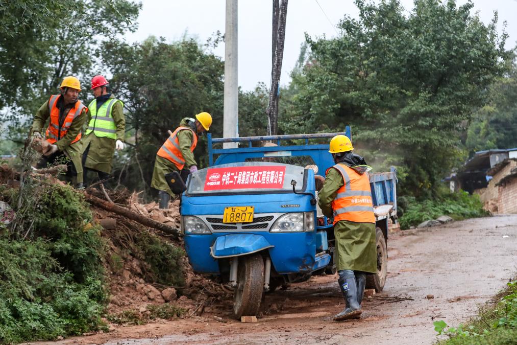 28日、漳県武陽鎮汪家河村で、道路の復旧作業にあたる作業員。(定西=新華社記者/郎兵兵)