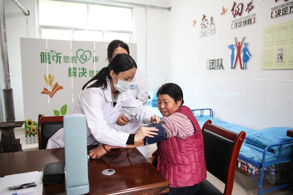 28日、避難所に指定された木林小学校で、被災者の血圧を測る医療スタッフ。(定西=新華社記者/郎兵兵)