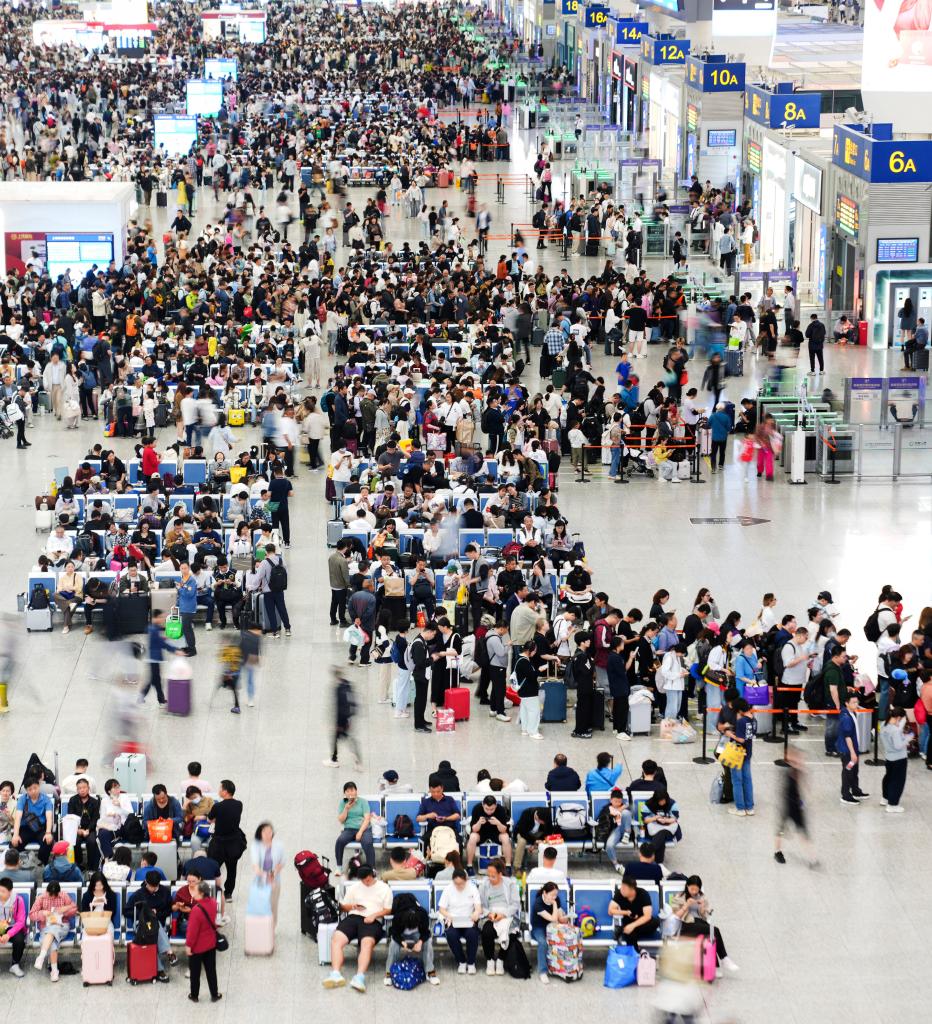 上海虹橋駅で列車を待つ乗客ら。(5月5日撮影、北京=新華社記者/丁汀)