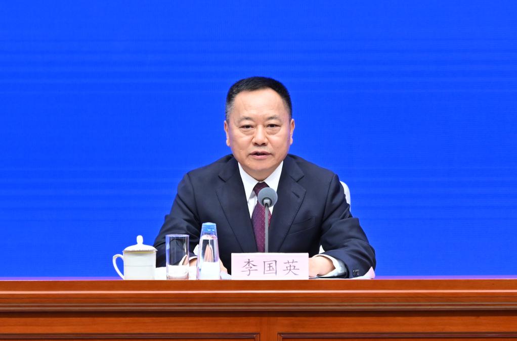 29日、国務院新聞弁公室が水利分野における発展の成果をテーマに開いた「第14次5カ年規画の質の高い達成」に関する記者会見に臨む李国英氏。(北京=新華社記者/李鑫)