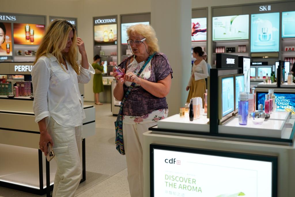 25日、成都市の市中免税店で、香水を選ぶ外国人観光客。(成都=新華社記者/胥氷潔)