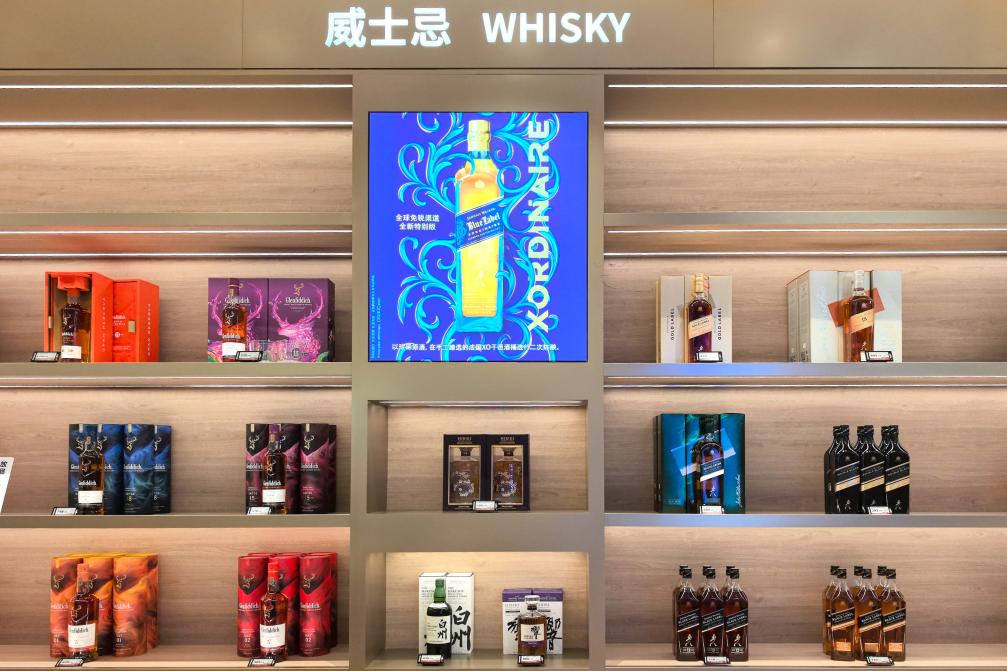 25日、成都市の市中免税店の棚に並ぶウイスキー。(成都=新華社記者/李倩薇)