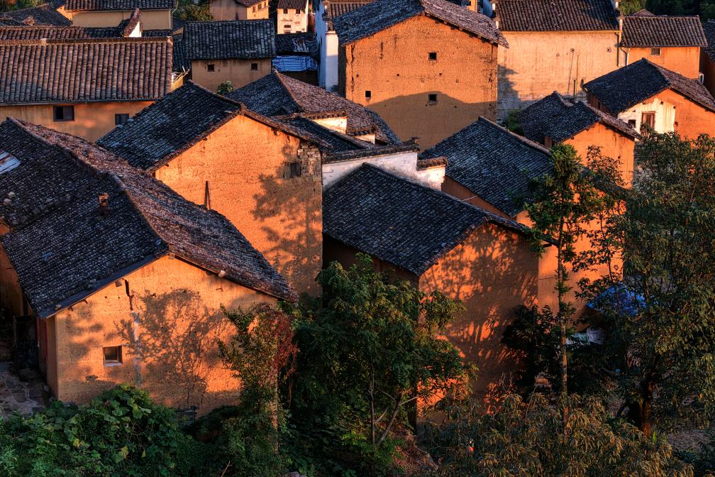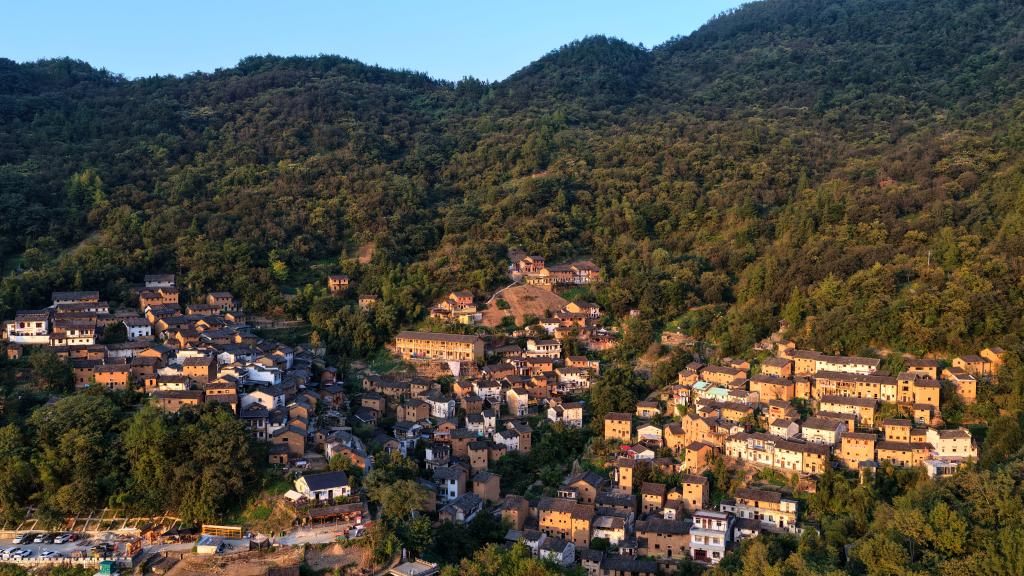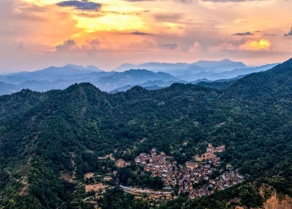 18日、空から見た夕暮れ時の陽産村。(ドローンから、黄山=新華社記者/黄博涵)