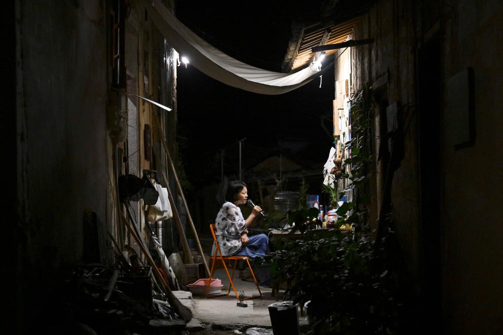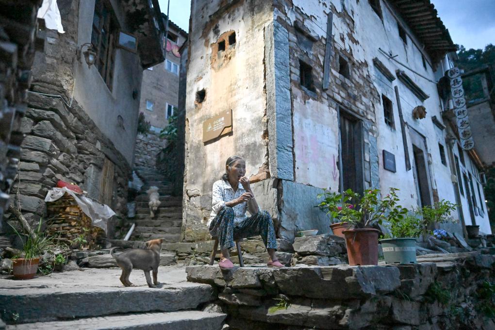 17日、自宅前でくつろぐ陽産村の住民。(黄山=新華社記者/黄博涵)