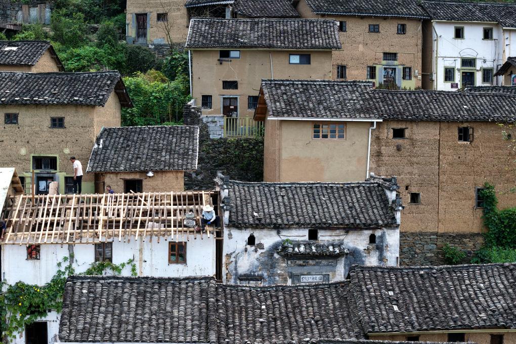 18日、家屋を修繕する陽産村の住民。(ドローンから、黄山=新華社記者/黄博涵)