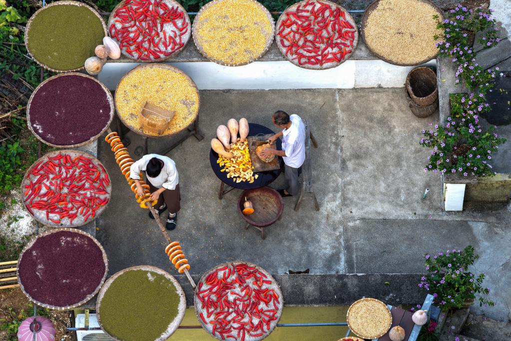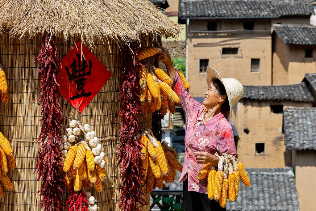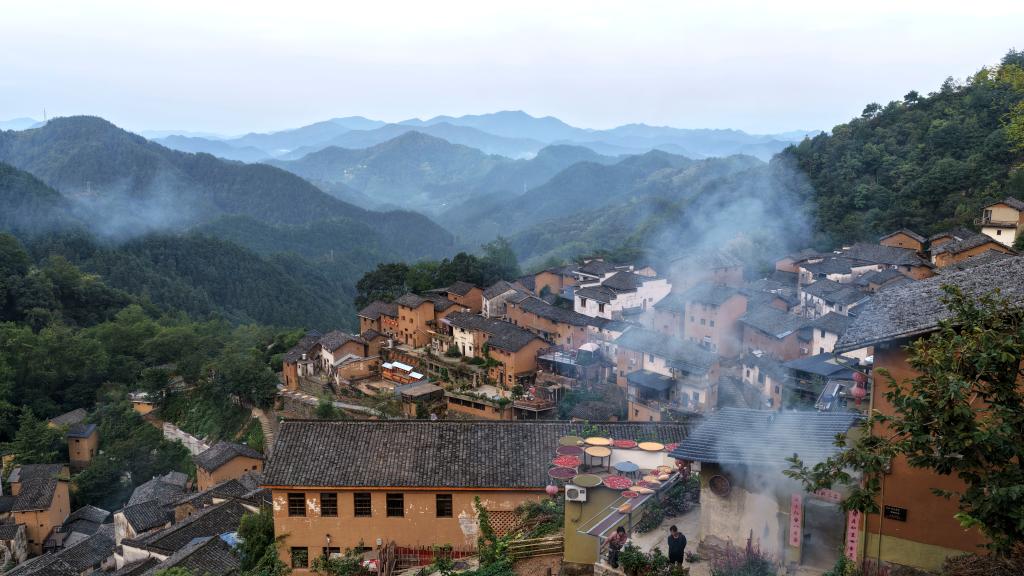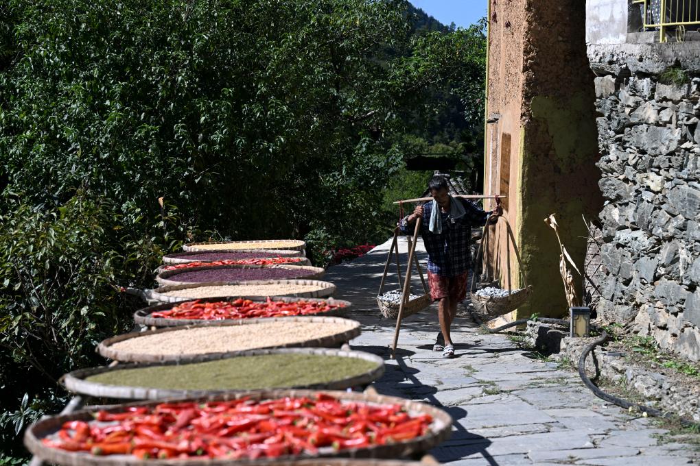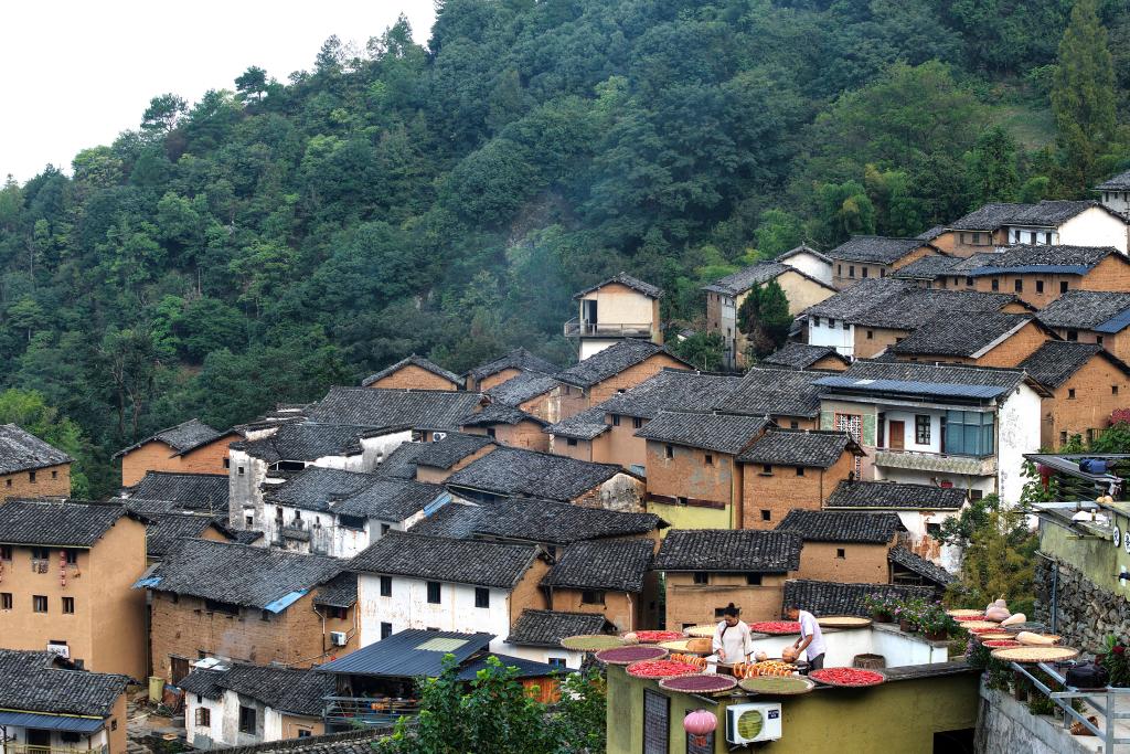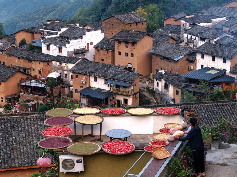 【新華社黄山9月30日】中国安徽省黄山市歙(きゅう)県の山間部に位置する陽産村は、土壁で囲んだ方形や長方形の伝統集合住宅「土楼」数百棟が連なることで知られ、2013年に第2次中国伝統村落リストに登録された。秋の収穫期、村民はトウガラシやトウモロコシ、クルミなどを自宅近くで天日干しする。