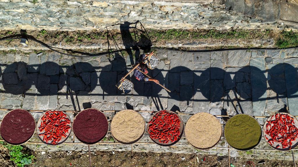19日、天秤棒を担ぎ、天日干しされた農作物の横を歩く人。(ドローンから、黄山=新華社記者/黄博涵)