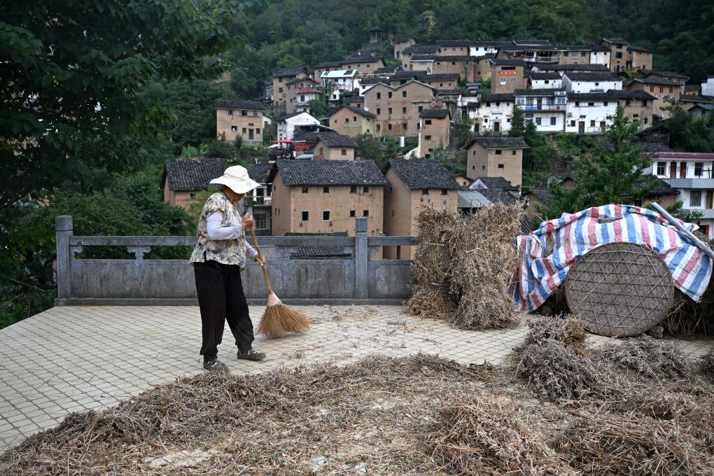 17日、土楼前で農作物を天日干しする陽産村の住民。(黄山=新華社配信/施亜磊)