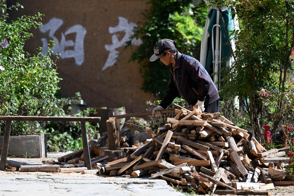 19日、まきを割る陽産村の住民。(黄山=新華社記者/黄博涵)