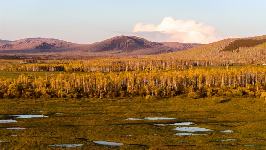25日、内モンゴル自治区アルグン市(フルンボイル市管轄下の県級市)に広がるシラカバ林と湿地。(ドローンから、フルンボイル=新華社記者/馬金瑞)