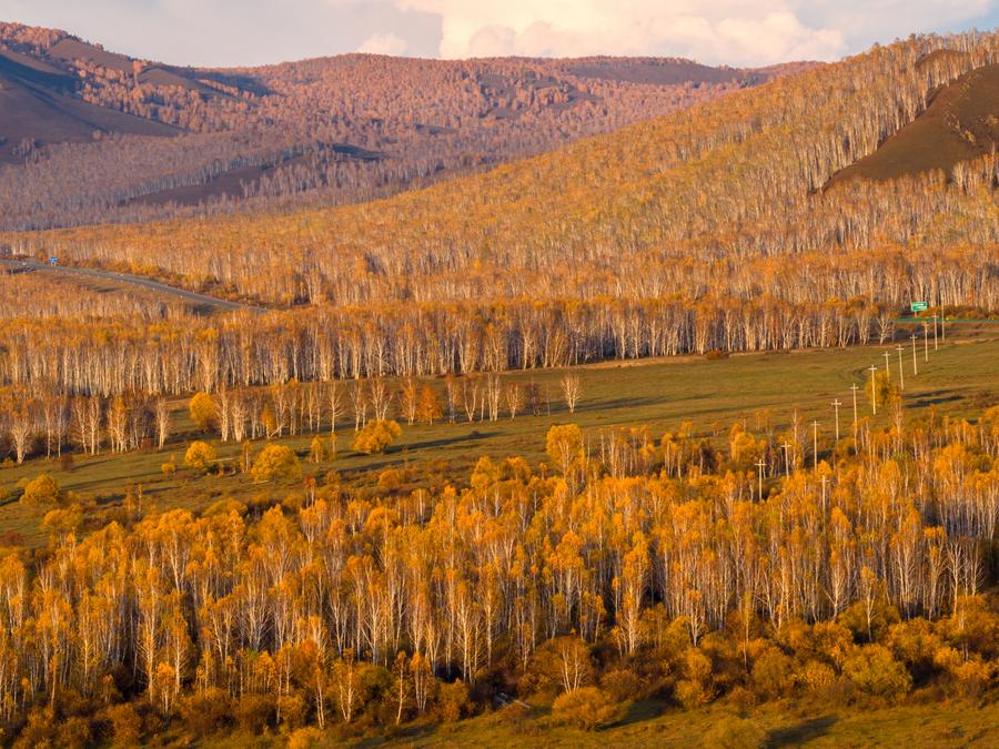 25日、内モンゴル自治区アルグン市(フルンボイル市管轄下の県級市)に広がるシラカバ林。(ドローンから、フルンボイル=新華社記者/馬金瑞)