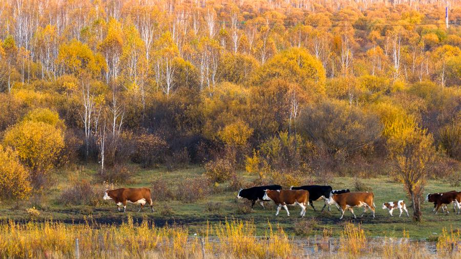 25日、内モンゴル自治区アルグン市(フルンボイル市管轄下の県級市)の林で草を食べる牛の群れ。(ドローンから、フルンボイル=新華社記者/馬金瑞)