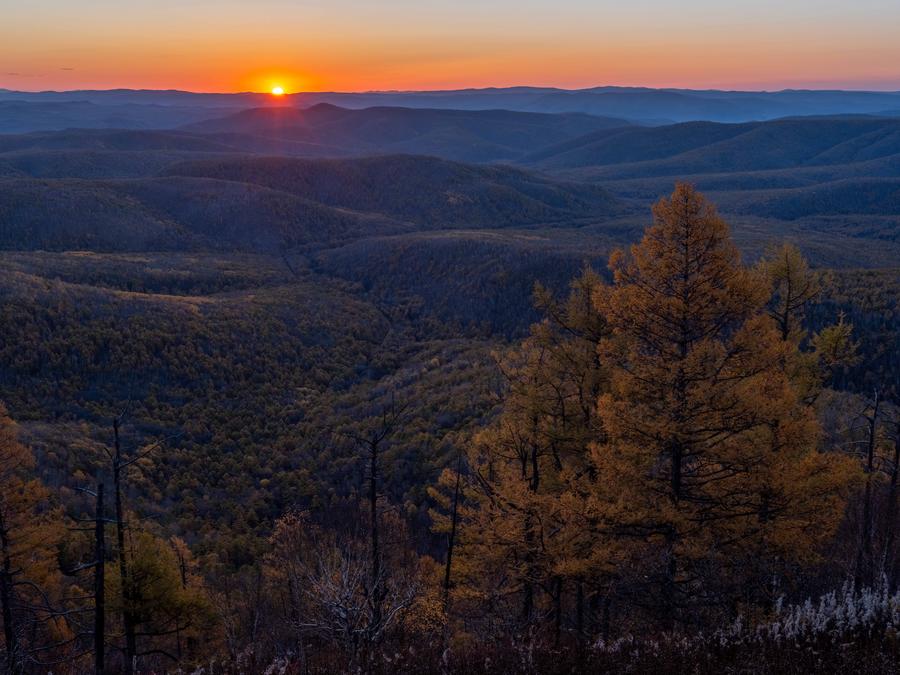 28日、内モンゴル自治区ヤクシ市(フルンボイル市管轄下の県級市)で撮影した大興安嶺の日の出。(フルンボイル=新華社記者/馬金瑞)