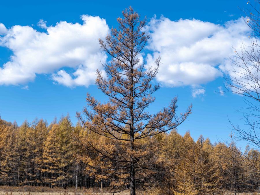 28日、内モンゴル自治区ヤクシ市(フルンボイル市管轄下の県級市)に広がるグイマツ林。(フルンボイル=新華社記者/馬金瑞)