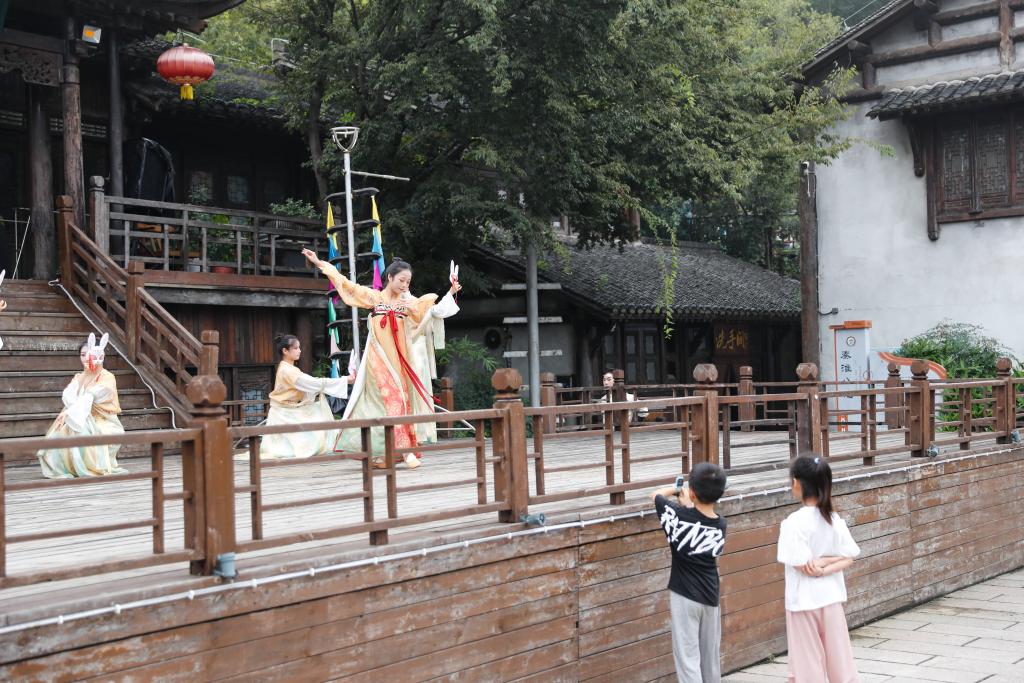 27日、宝華山国家森林公園の「千華古村」で演目を披露する役者。(句容=新華社記者/季春鵬)