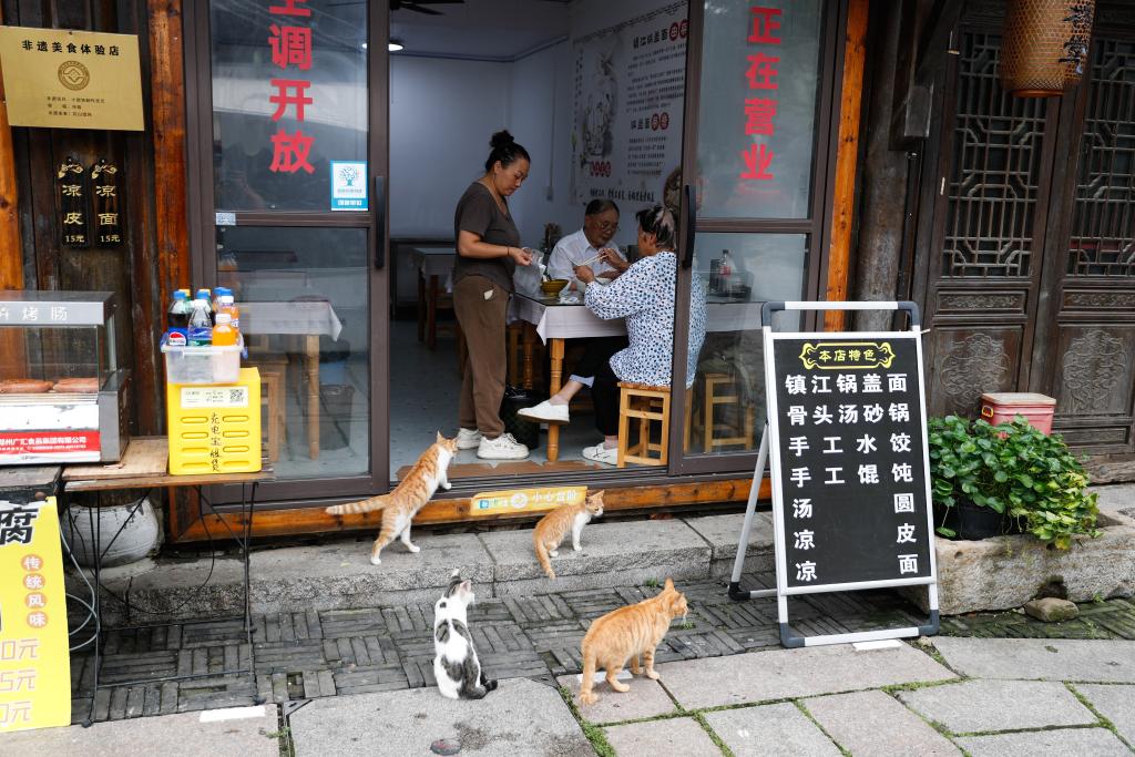 27日、宝華山国家森林公園の「千華古村」で食事を楽しむ観光客。(句容=新華社記者/季春鵬)