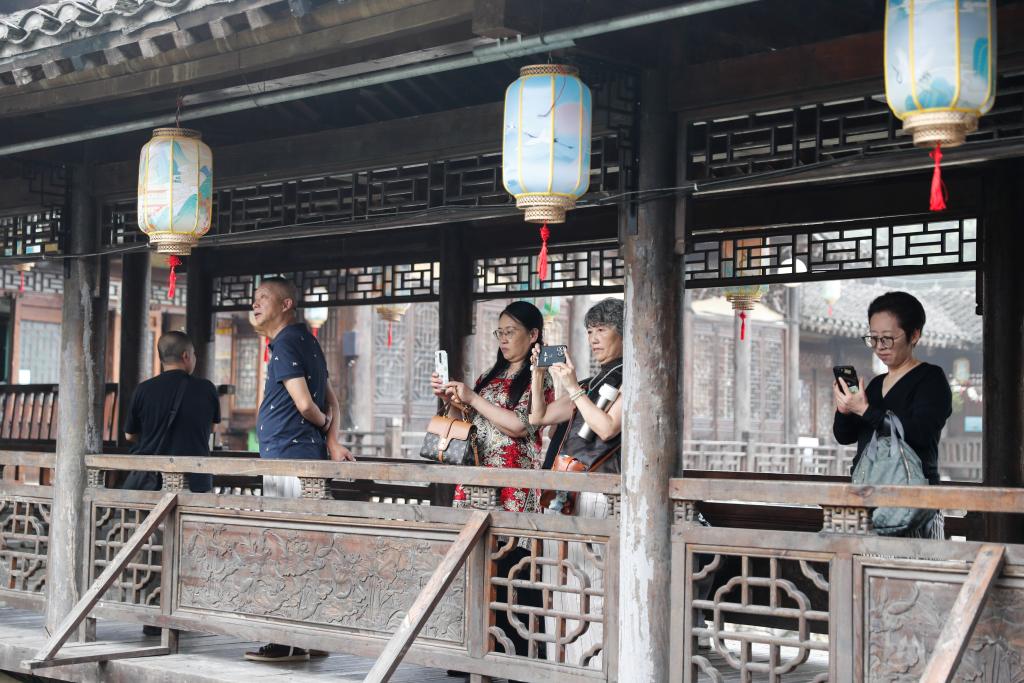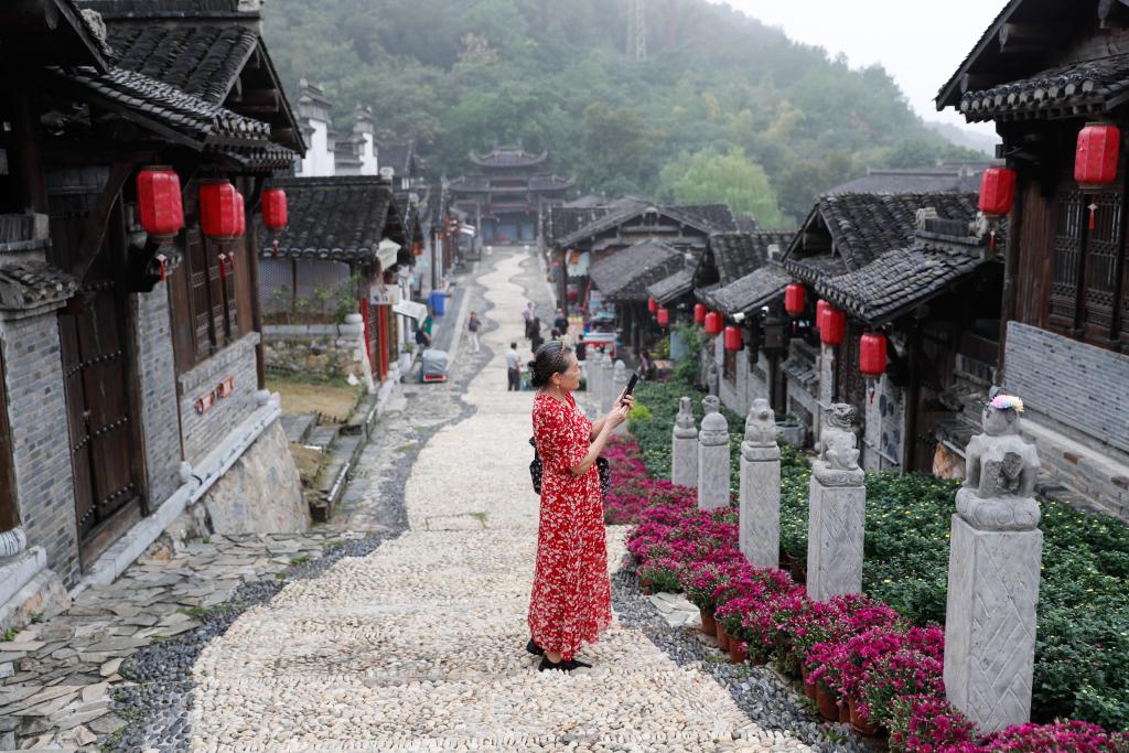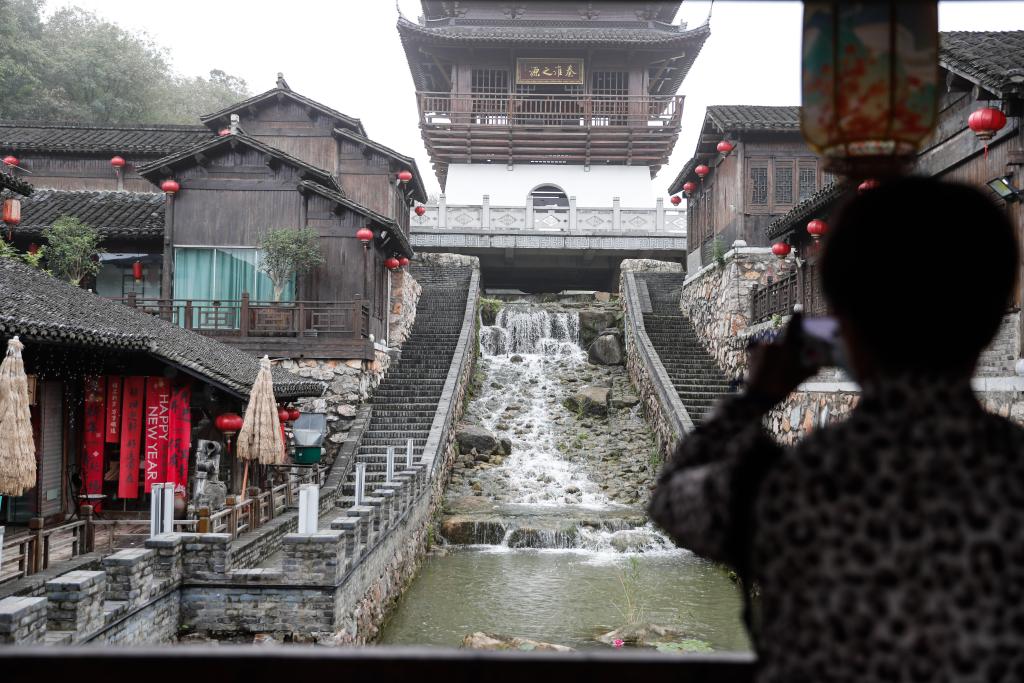 27日、宝華山国家森林公園の「千華古村」で写真を撮る観光客。(句容=新華社記者/季春鵬)