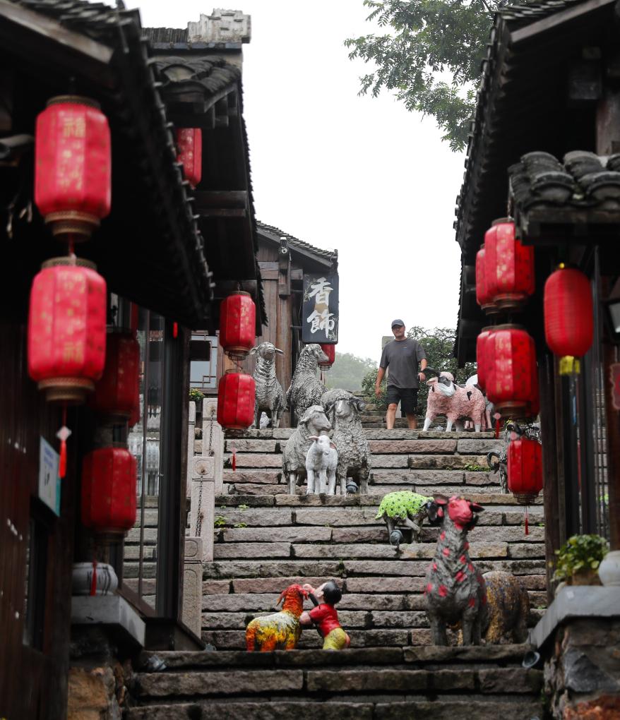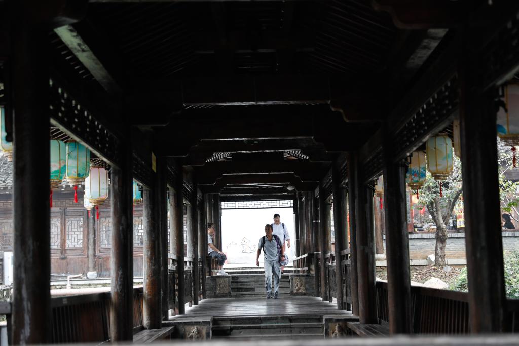 27日、宝華山国家森林公園の「千華古村」を散策する観光客。(句容=新華社記者/季春鵬)