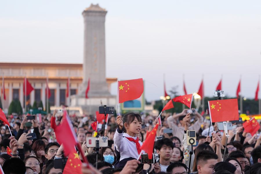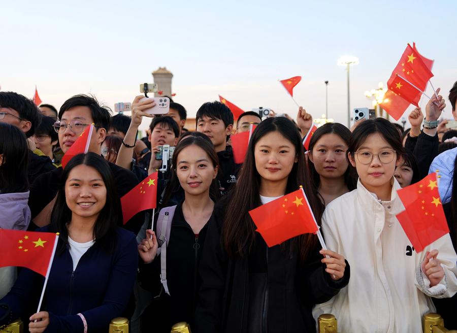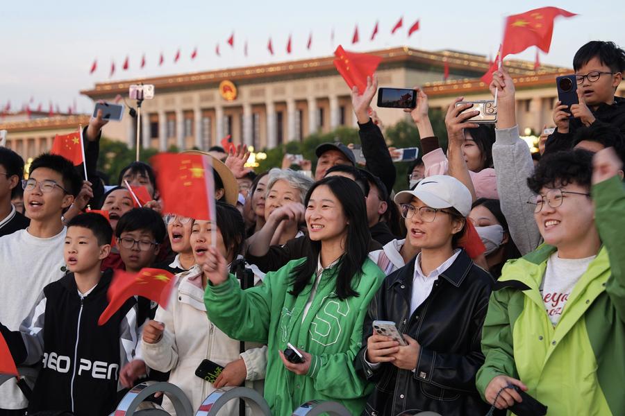 1日、国旗掲揚式の後、歓声を上げる人々。(北京=新華社記者/鞠煥宗)
