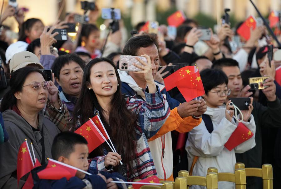 1日、北京の天安門広場で国旗掲揚式を見守る人々。(北京=新華社記者/鞠煥宗)