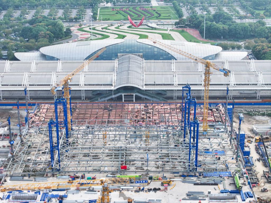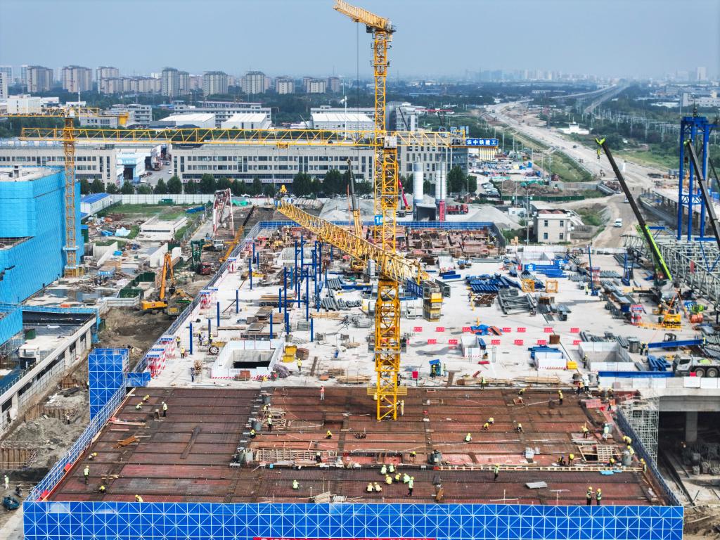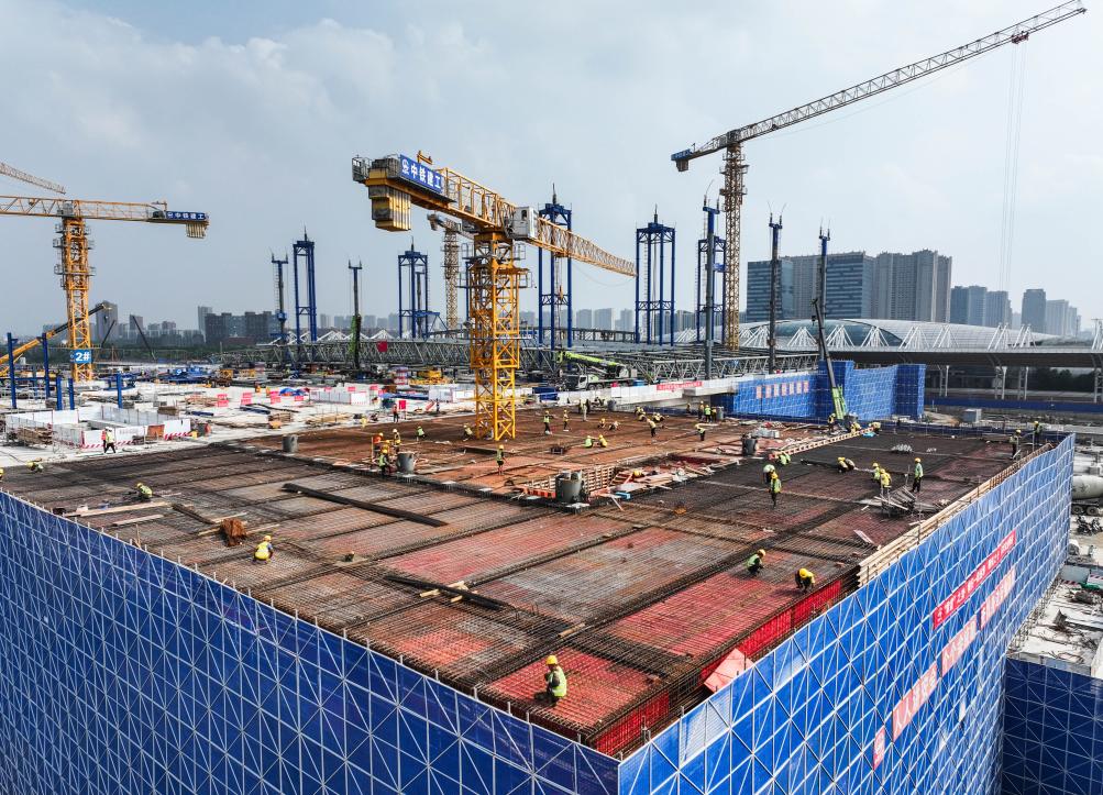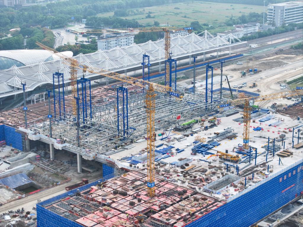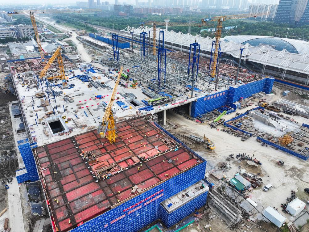 【新華社南通10月1日】中国の上海、南京、合肥を結ぶ「滬寧合(こねいごう)高速鉄道」の建設現場で、鉄道建設大手、中鉄建工集団が担う南通駅の工事が順調に進んでいる。高架駅舎Bエリアの鉄骨構造は既に完成しており、側面に配置される駅舎の本体構造も間もなく完成する。