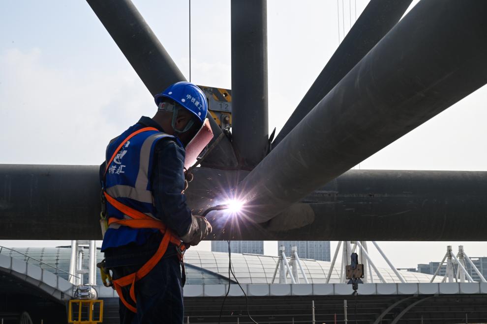 9月28日、溶接を行う中鉄建工集団の作業員。(南通=新華社記者/季春鵬)