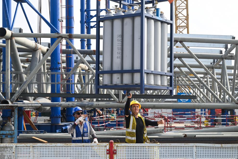 9月28日、建設現場で働く中鉄建工集団の作業員。(南通=新華社記者/季春鵬)