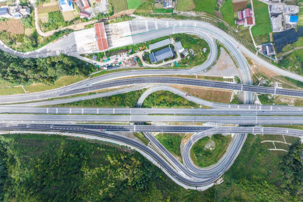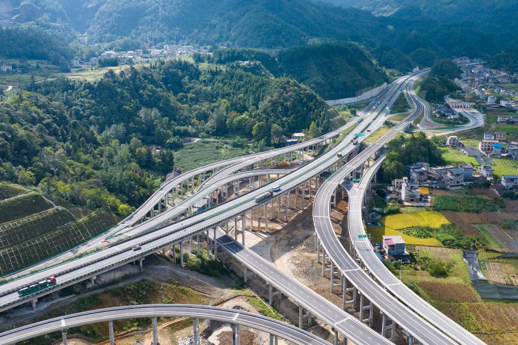 9月29日、桑竜高速道路の茅坪ジャンクション(湘西トゥチャ族ミャオ族自治州竜山県)。(ドローンから、長沙=新華社記者/陳思汗)