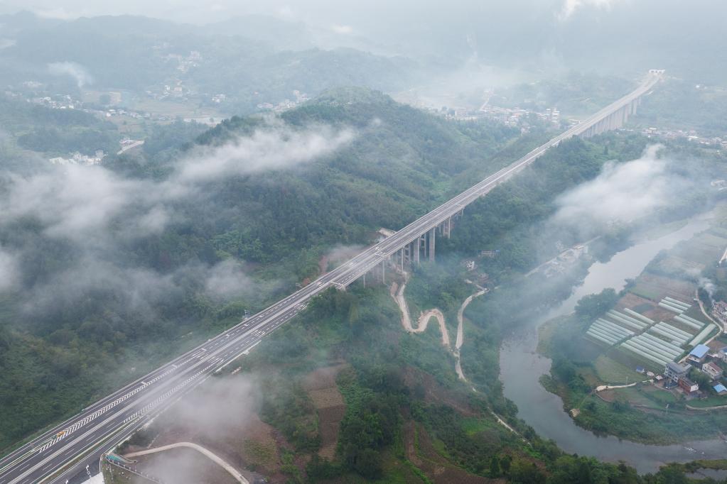9月29日、桑竜高速道路の帥郷特大橋(張家界市桑植県)。(ドローンから、長沙=新華社記者/陳思汗)