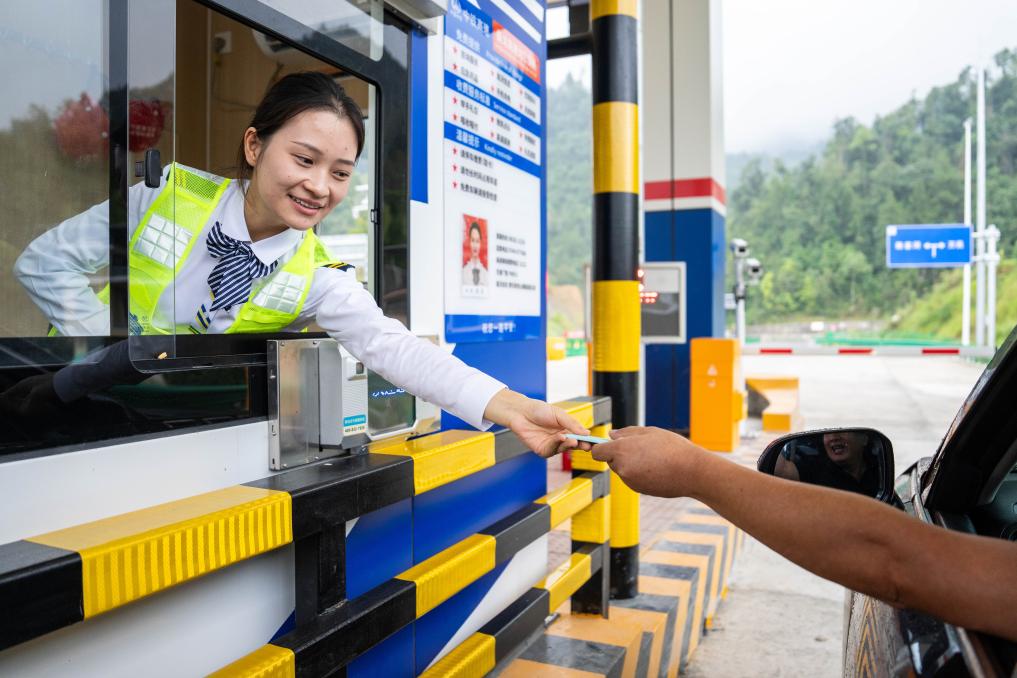 9月29日、桑竜高速道路の陳家河料金所で、通行券を渡す料金所の職員(左)。(長沙=新華社記者/陳思汗)