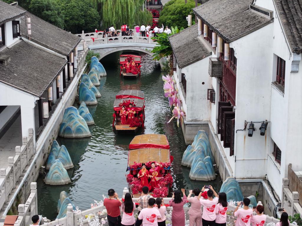 9月29日、甪直古鎮で合同結婚式に参加した新郎新婦。(ドローンから、蘇州=新華社記者/季春鵬)